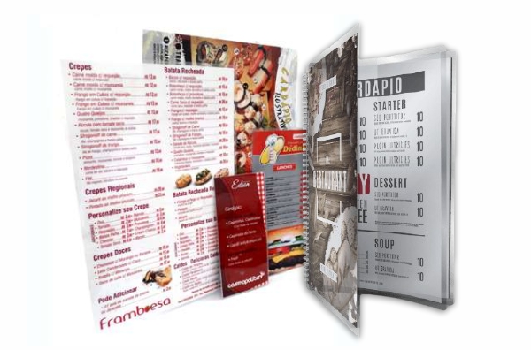 Cardápios e menus em PVC ou papel cartão par seu restaurante ou bar.